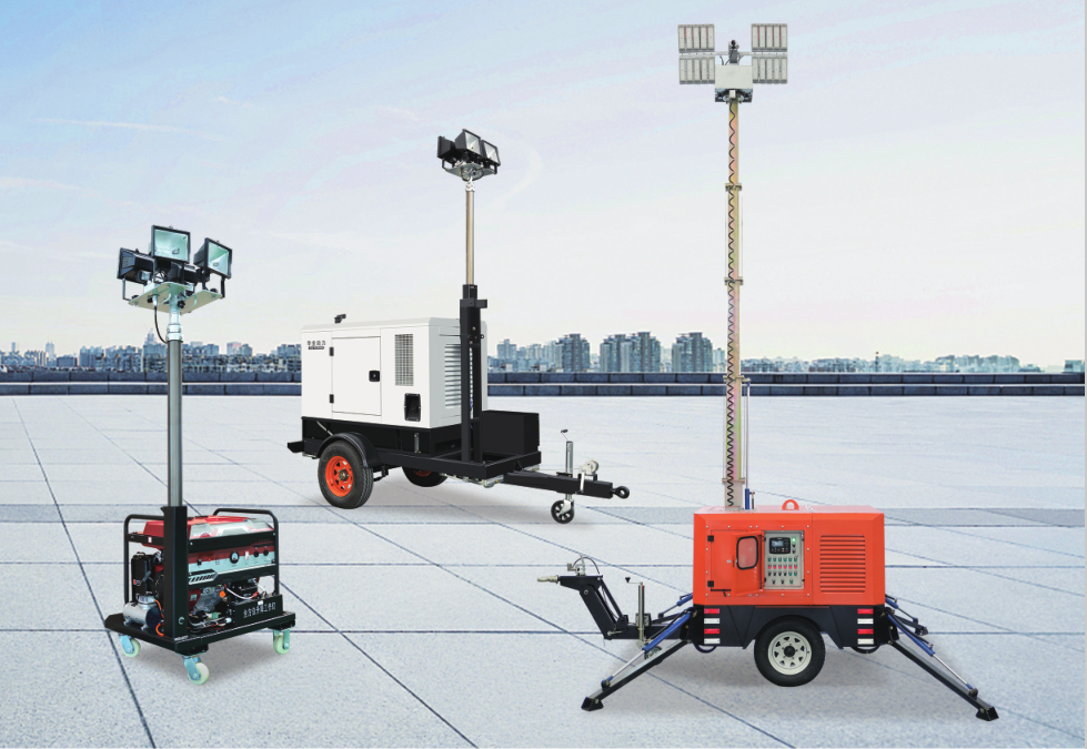 燈塔機組支持360°旋轉、遠程控制、單組單控、液壓支撐、一鍵復位、一鍵升降、照明發電一體,配置高速移動拖車升降高度2.5-12米。